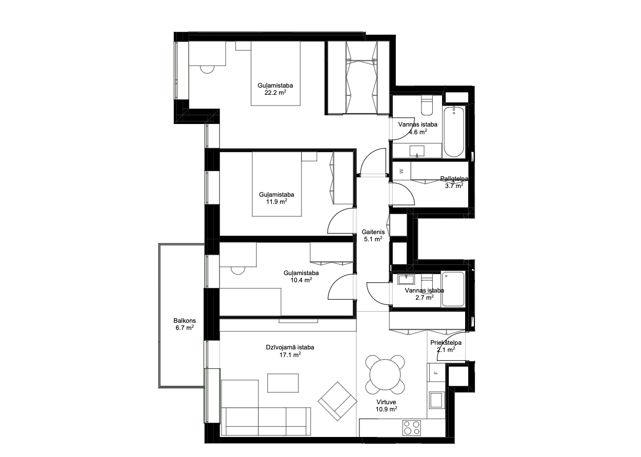 • Katrā istabā rozetes un slēdži, izbūvēti izvadi gaismas ķermeņiem katrā istabā, nodrošinātas pieslēguma vietas virtuves tehnikai.