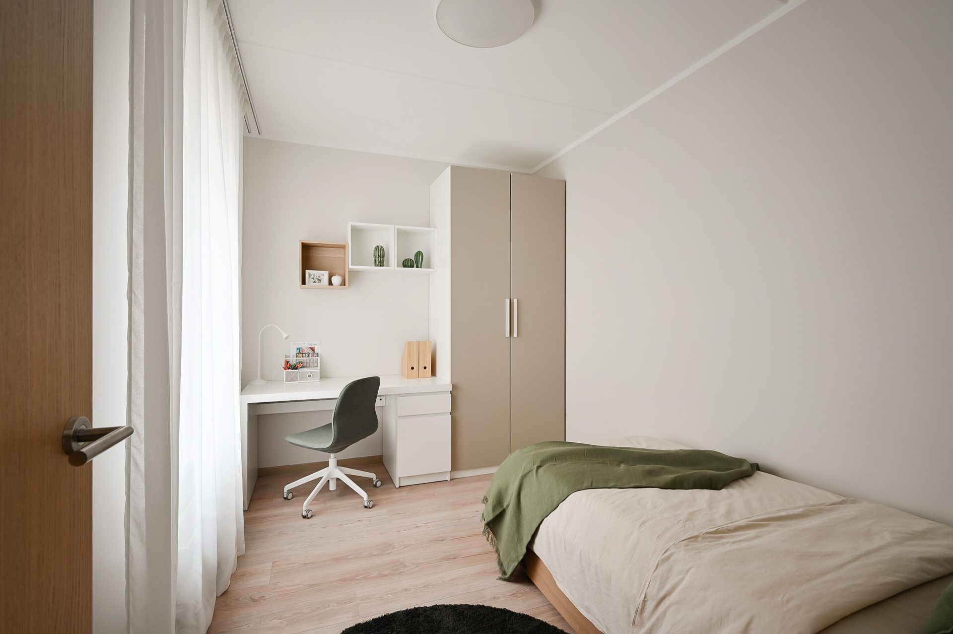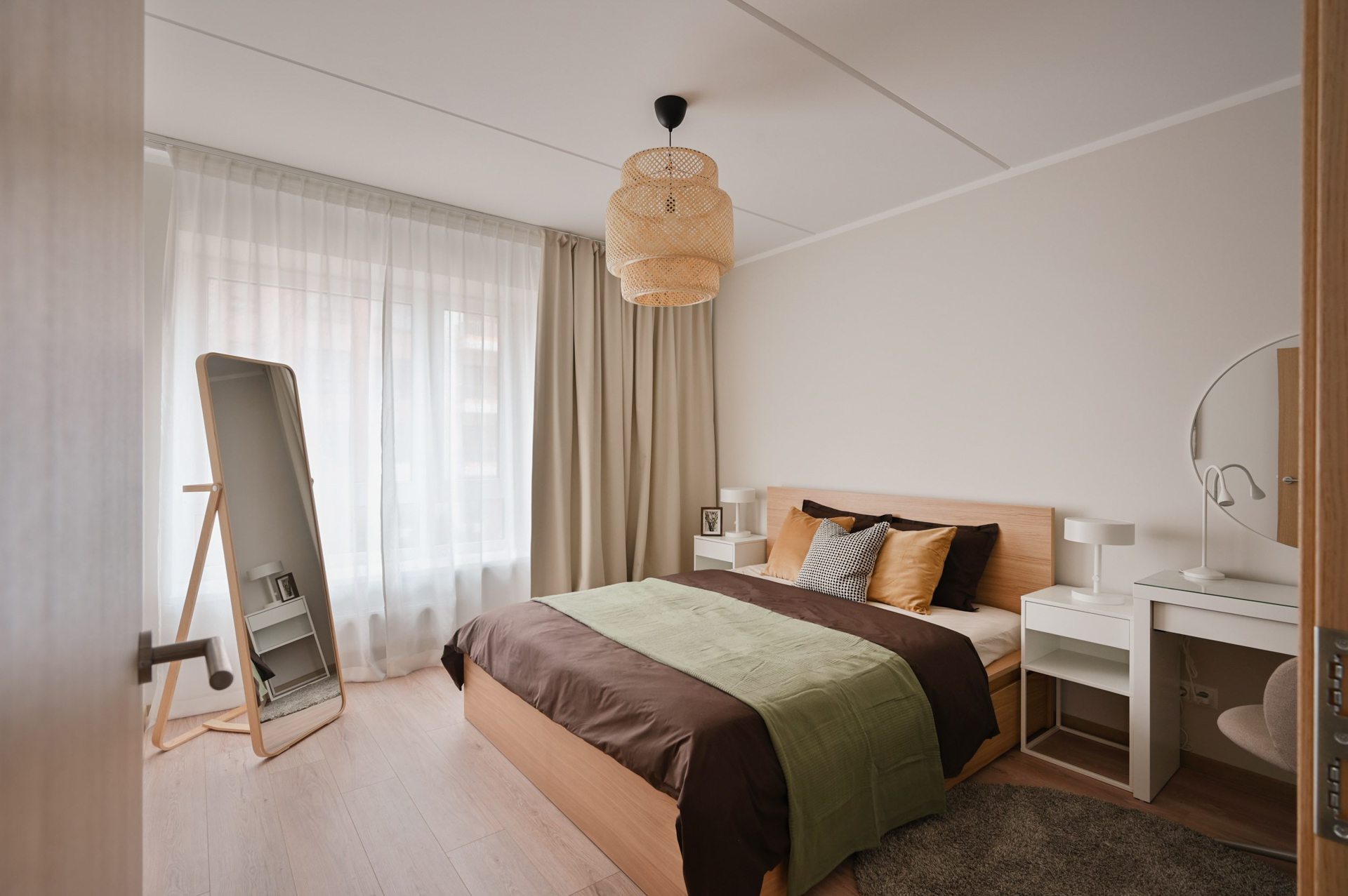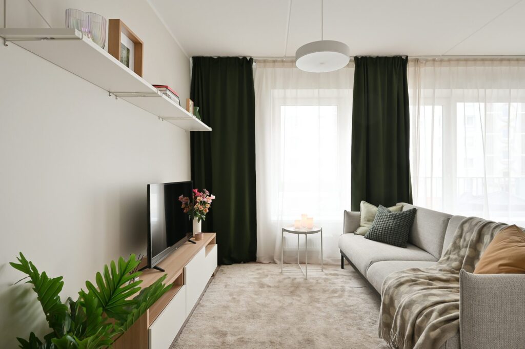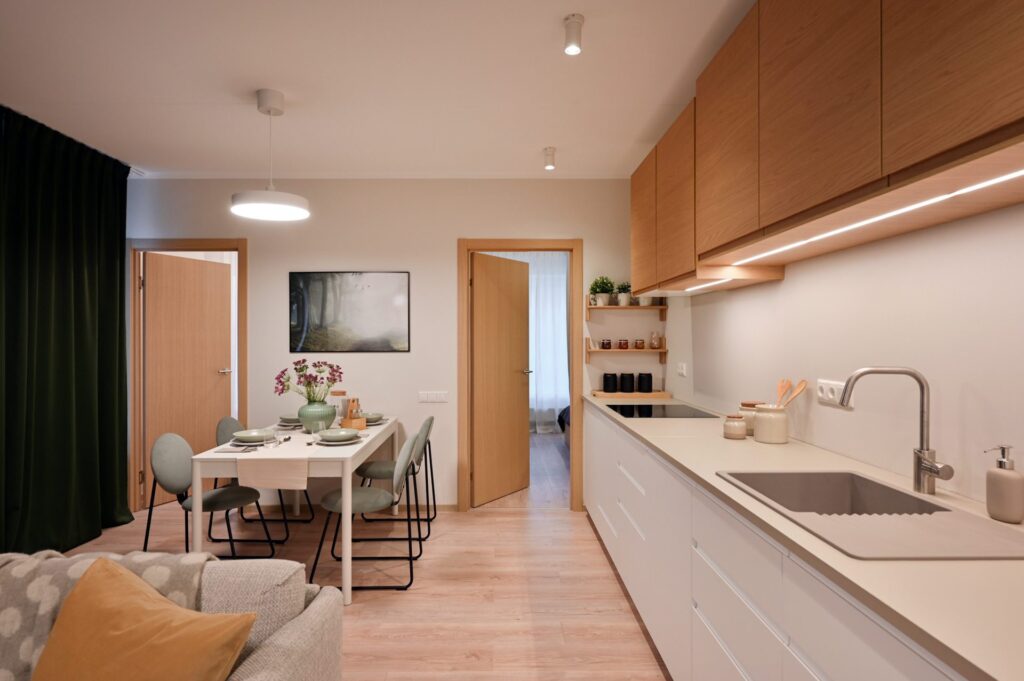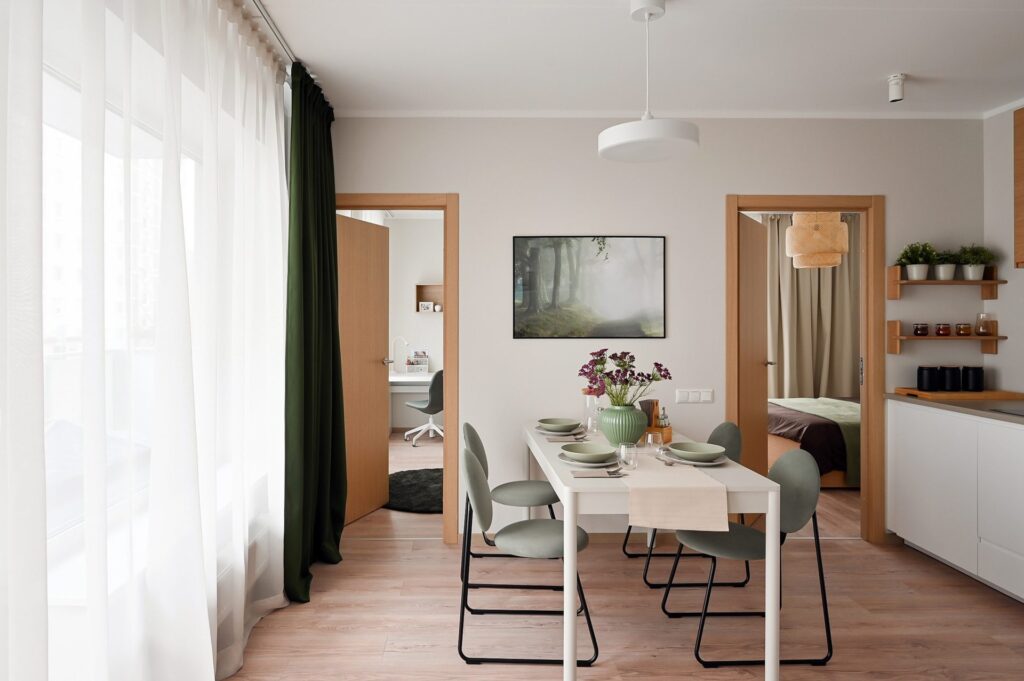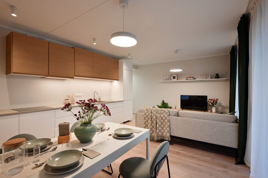 • Dzīvojamās istabās, virtuvēs un guļamistabās lamināta grīda segums (32. klase, 8 mm) ar skaņas izolējošo kārtu.