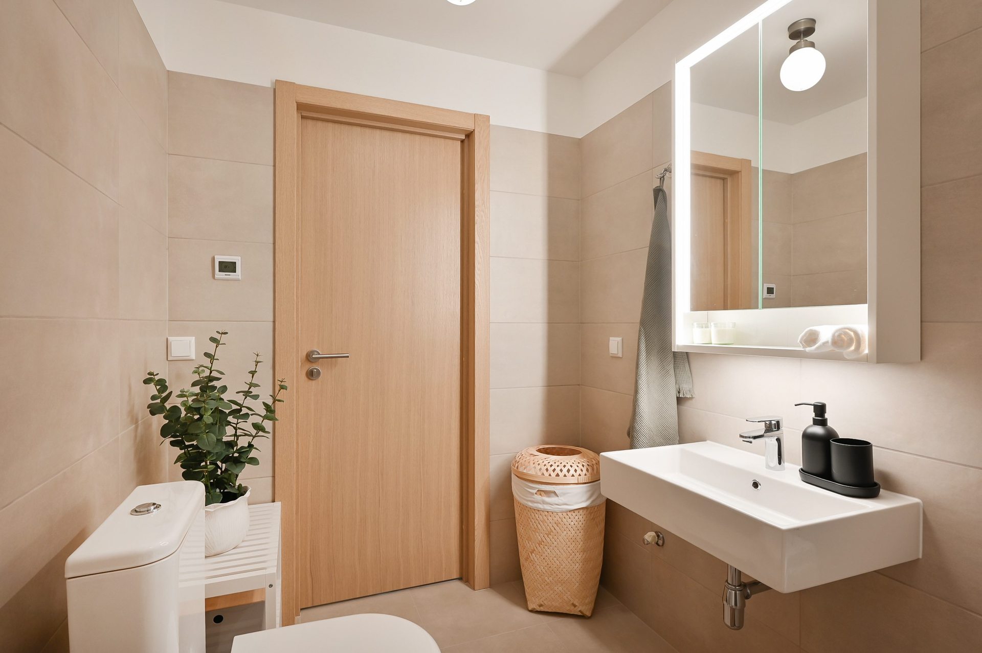• Vannas istabā flīzētas sienas un grīda.