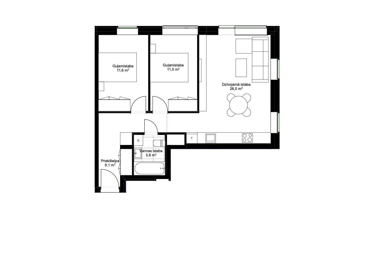 • Dzīvokļa iekšējās durvis – laminētas durvis ar koka karkasu un skaņas izolējošu materiālu.