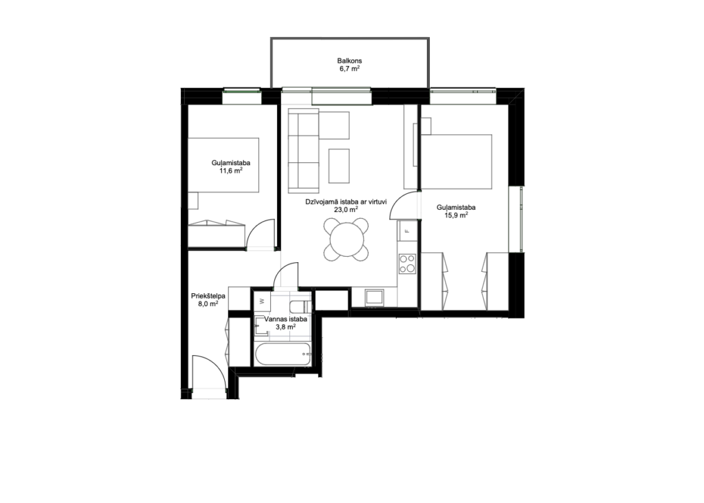 • Dzīvokļa iekšējās durvis – laminētas durvis ar koka karkasu un skaņas izolējošu materiālu.