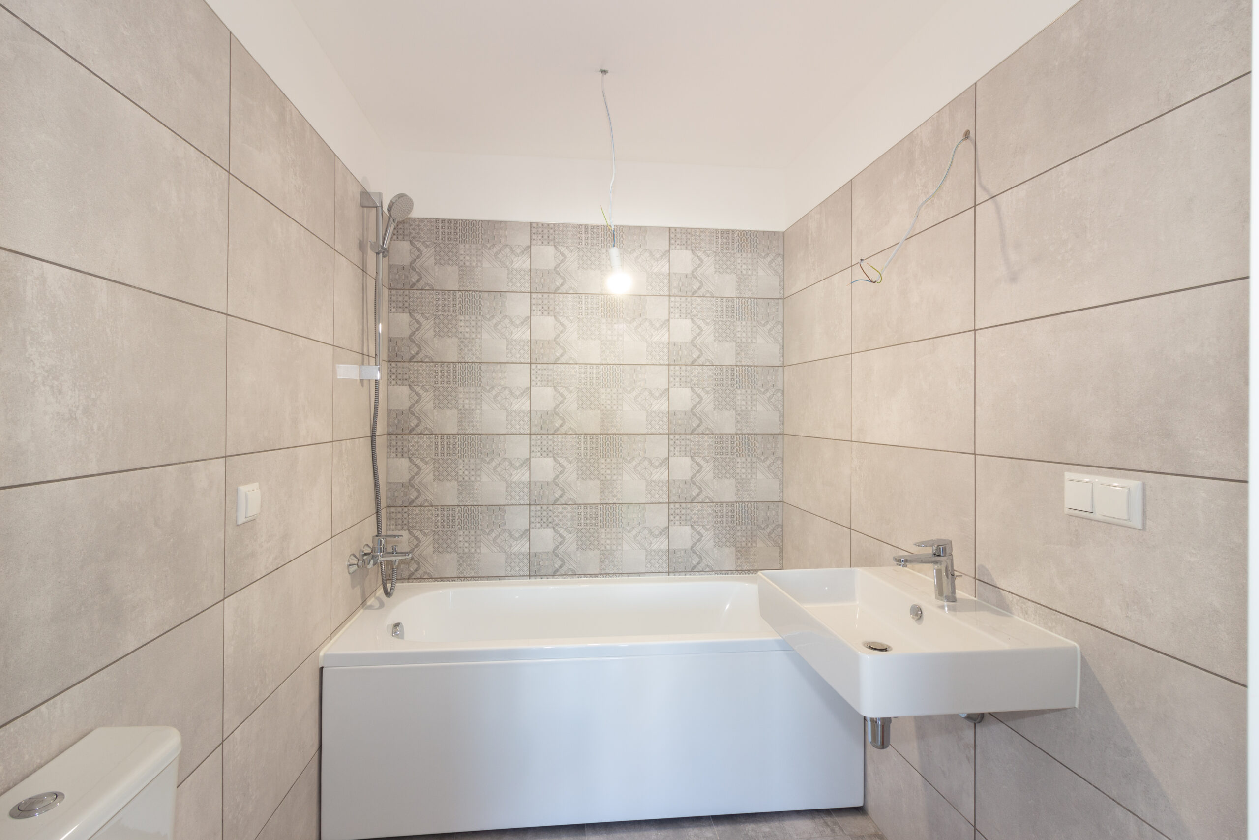 • Vannas istabā flīzētas sienas un grīda.
